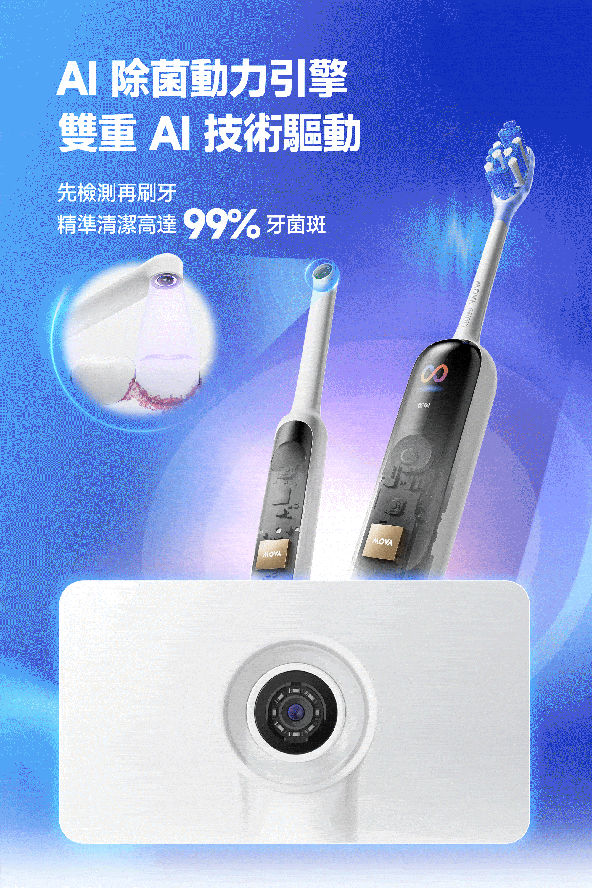 搭載30萬畫素高清內視鏡鏡頭,結合AI智能影像分析技術,即時掃描牙齒表面與縫隙位置,自動生成牙菌斑分布圖。讓使用者清楚掌握清潔死角與殘留狀況,刷牙效果一目了然,大幅提升口腔護理效率。