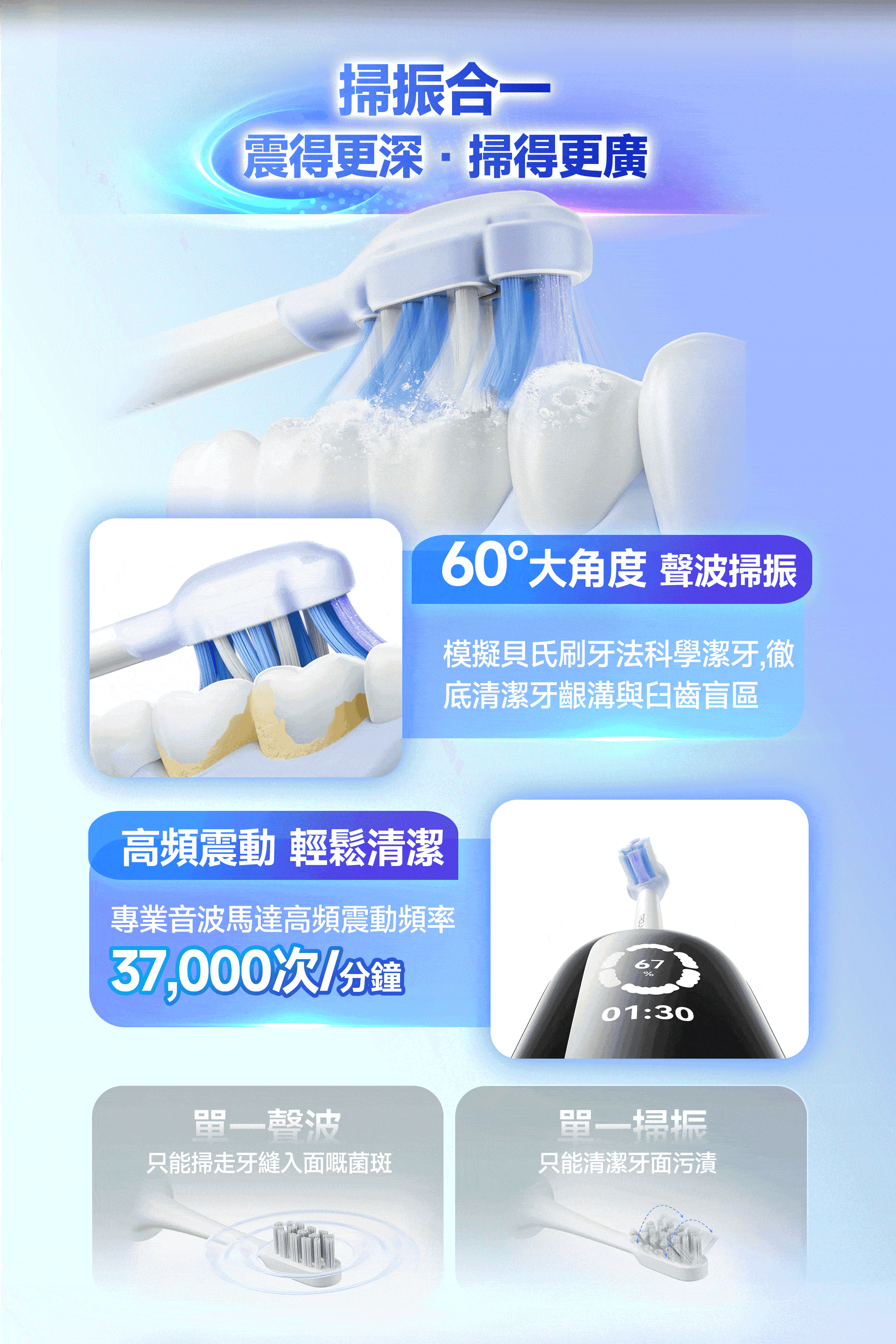 內建每分鐘22,800次高頻音波震動系统,精準模擬專業牙醫橫掃清潔手法。高效震碎牙菌斑結構,同時溫和呵護牙齦組織,實現深層潔淨與舒適體驗兼顧。
