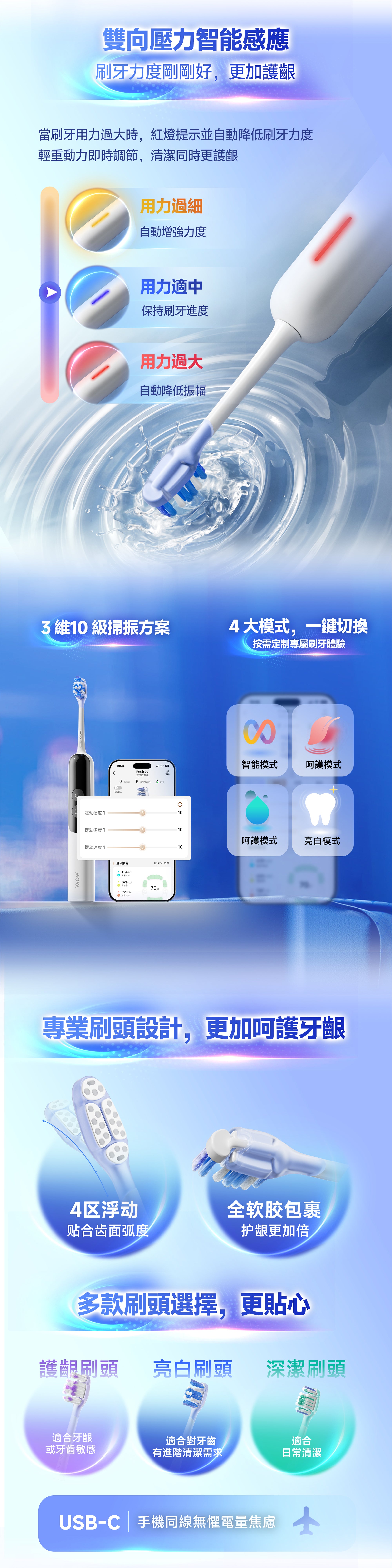 搭載高靈敏壓力感測模組,當刷牙力度過大時即亮紅燈並自動降頻保護牙齦;力度不足則亮黃燈提示加強清潔。透過多重智能調節機制,有效平衡清潔力與舒適度。