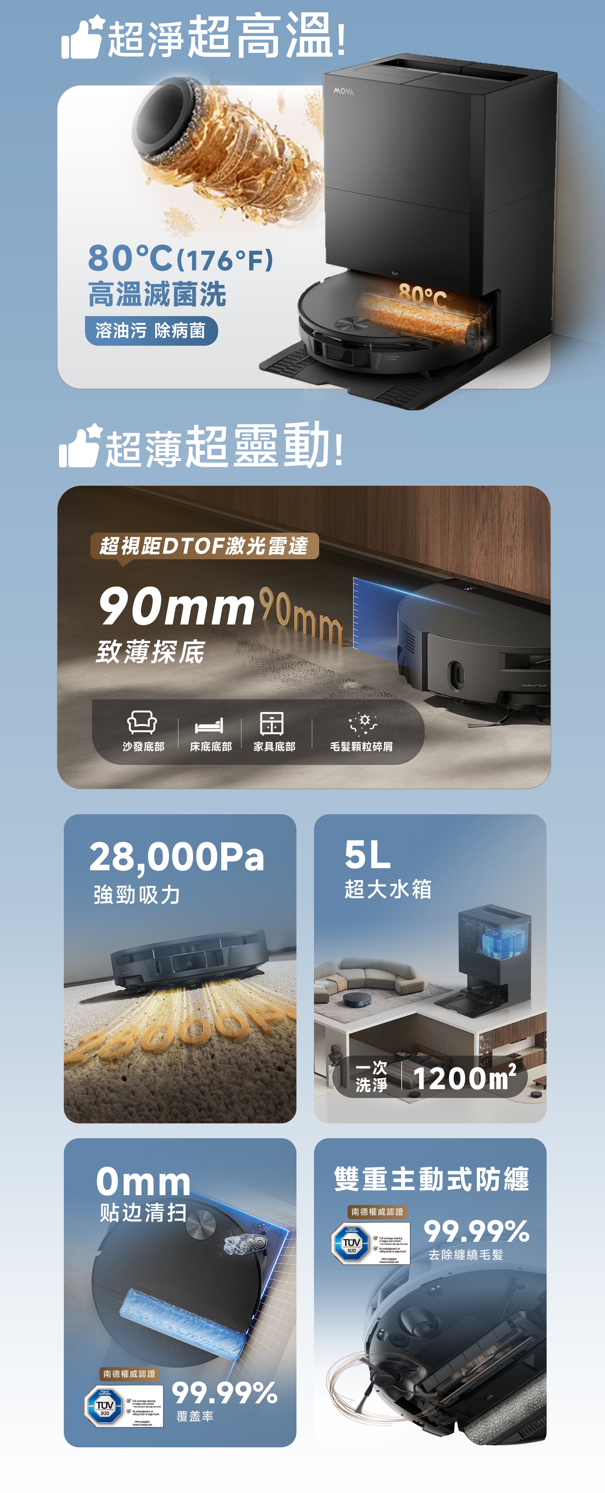 集合自動集塵、智能補水、熱水洗拖及熱風烘乾於一體,由清潔到保養全程自動完成,大幅減少日常打理時間,真正實現長時間勤手的輕鬆清潔體驗。