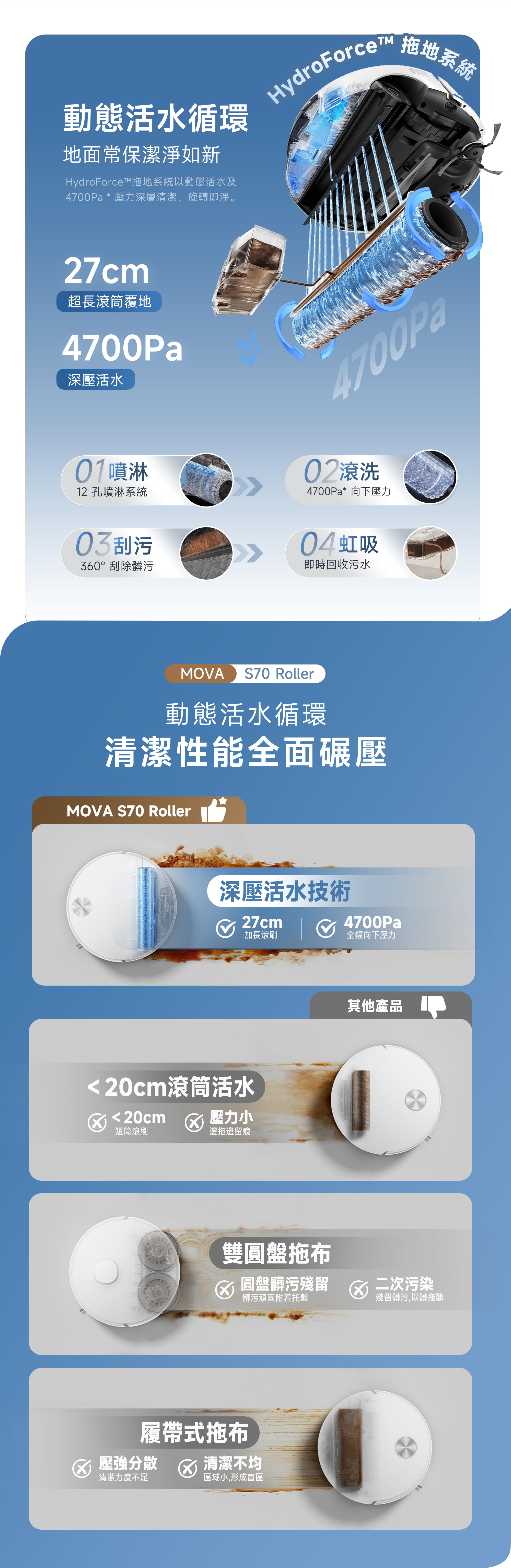透過12組高壓噴嘴即時冲洗滚刷,配合4700Pa強勁下壓力模擬,人手反覆刷洗,即使是乾掉的頑固污漬都能被徹底瓦解,拖過即,地面時