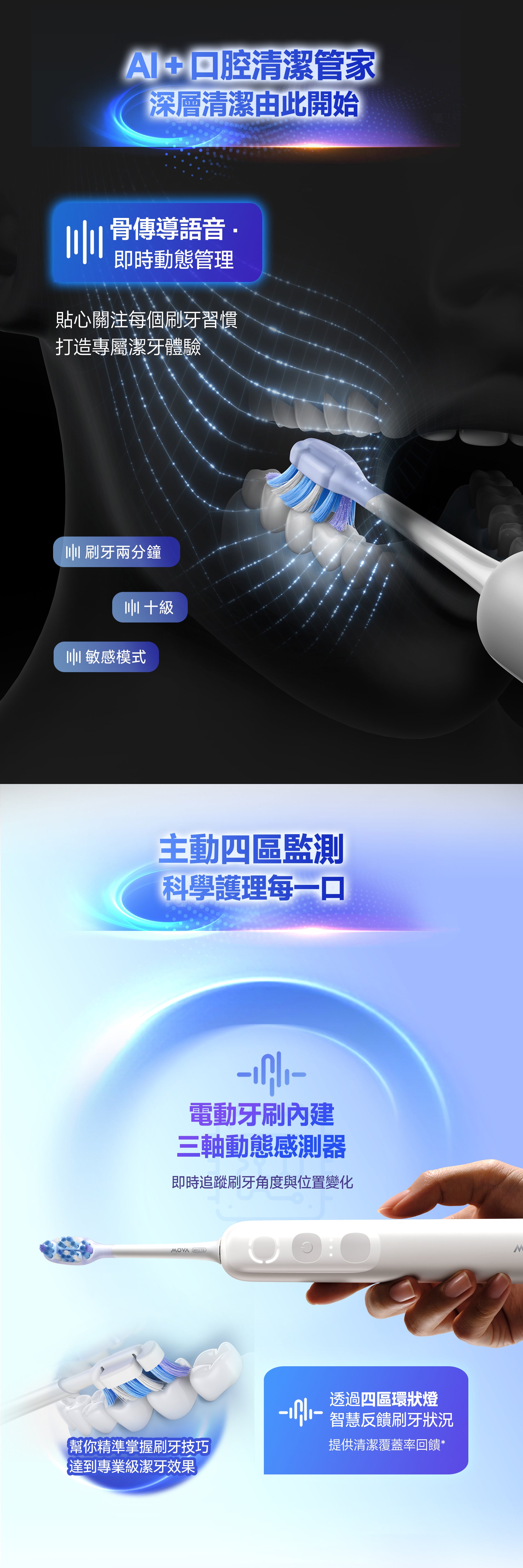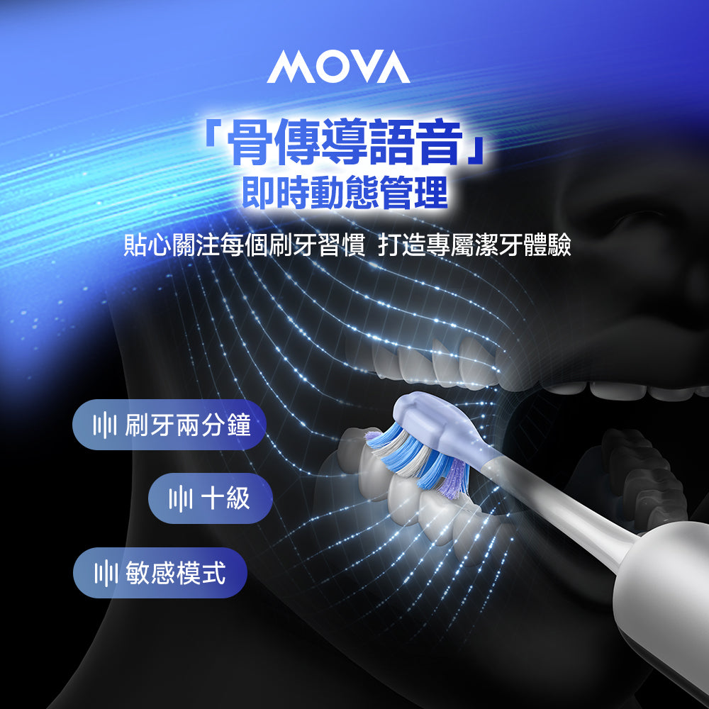內建骨傳導語音回饋技術,於刷牙過程中即時提醒力度、區域分配與刷牙時長。協助使用者建立正確刷牙節奏與方式,避免過度用力或清潔不足,提升安全性與專業度。