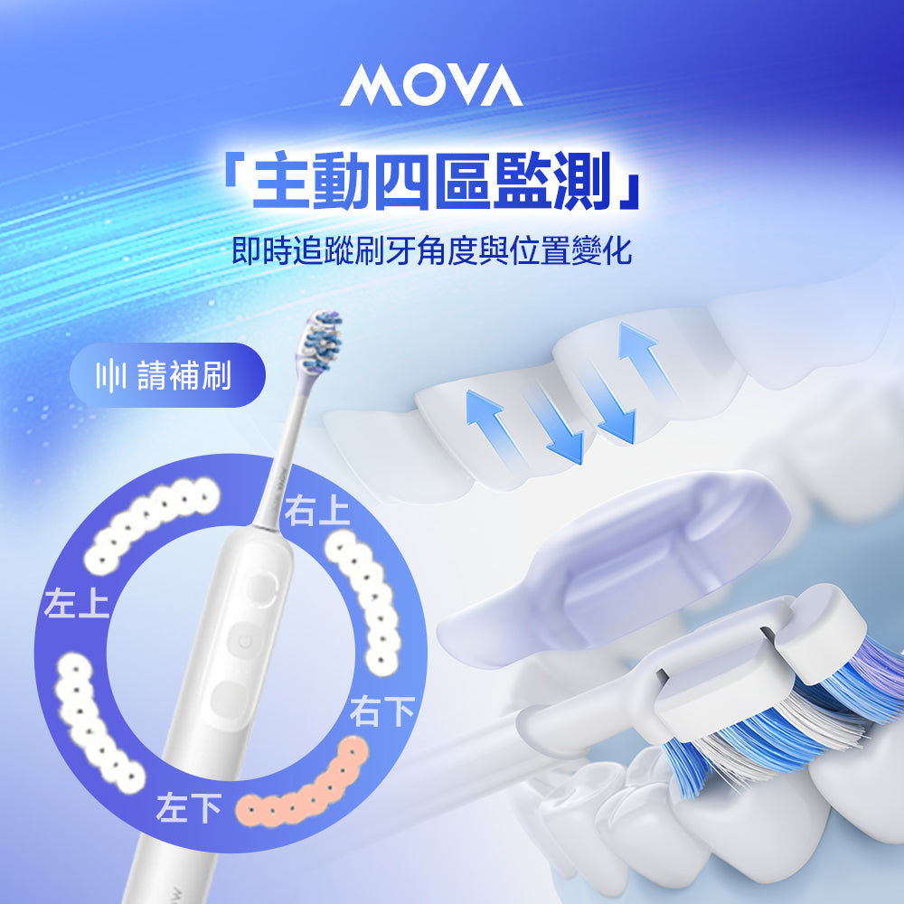 採用4區獨立浮動刷頭結構,可根據不同牙齒弧度與排列狀況自動調整貼合角度。有效深入後排牙齒與齒縫盲區,確保每一顆牙齒都能獲得均勻徹底清潔。