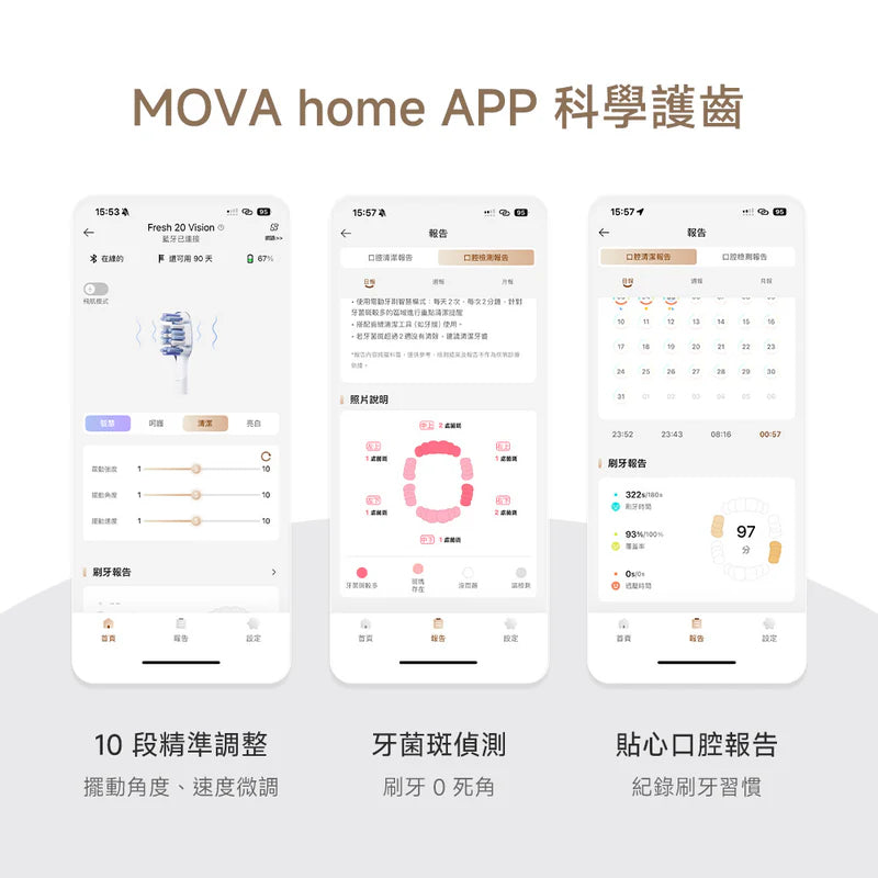- 智能壓力感應: 紅燈提示過大力道自動降頻,黃燈提醒力度不足需加強清潔,全面守護牙齦
