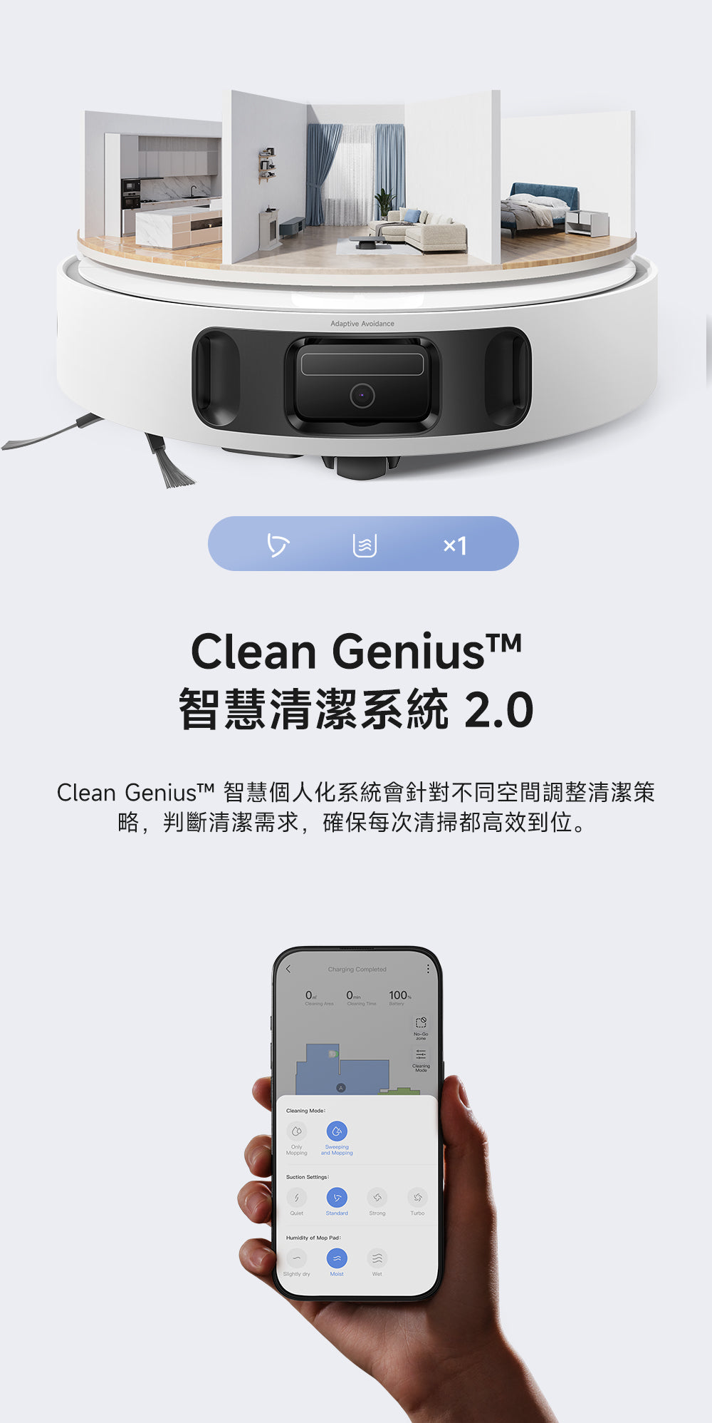- 拖布自動清洗:底座自動清潔拖布,保持潔淨,無需人手。