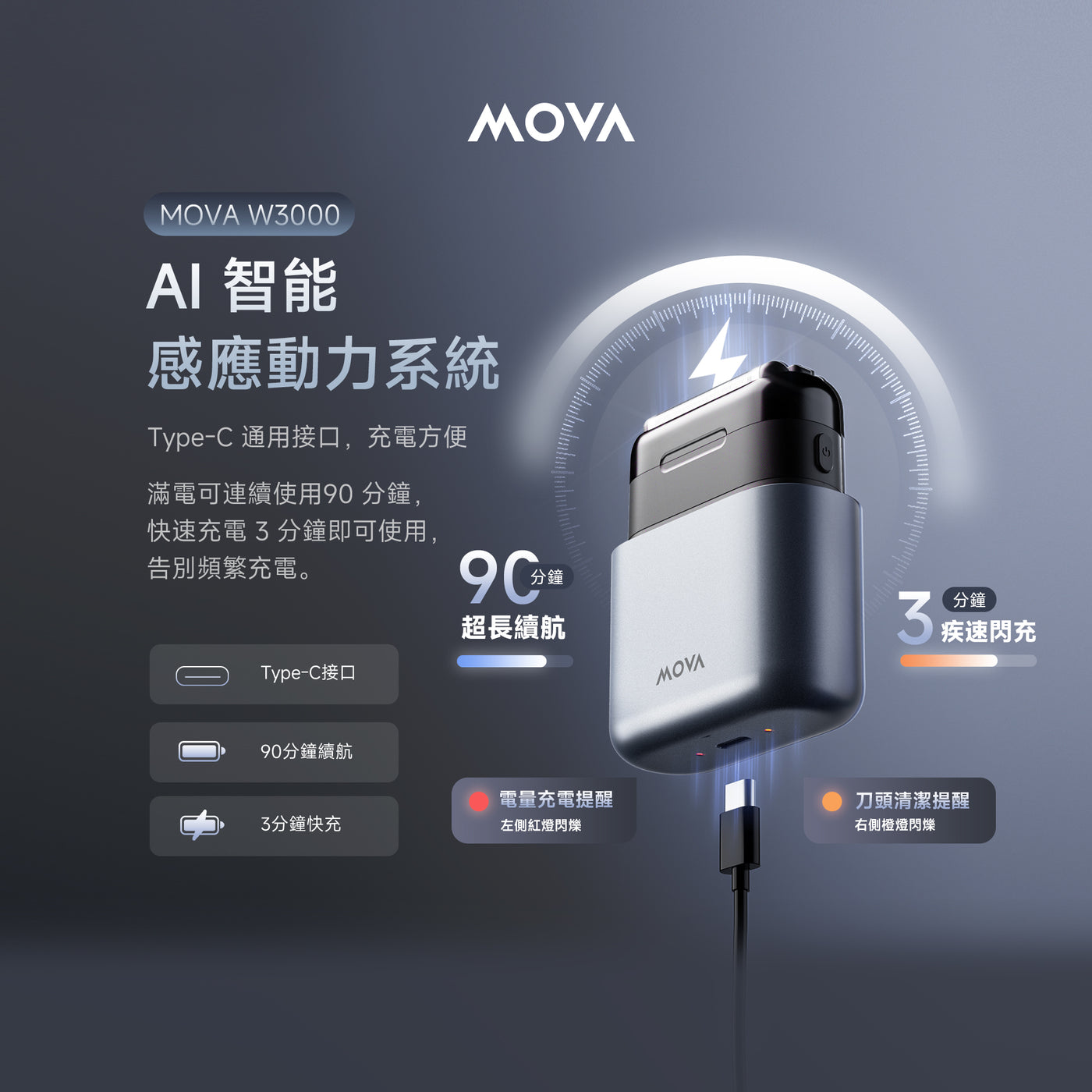 只需充電 3 分鐘,即可提供一次完整剃鬚所需電量;充滿電後最長可使用約 90 天(視使用頻率而定)。