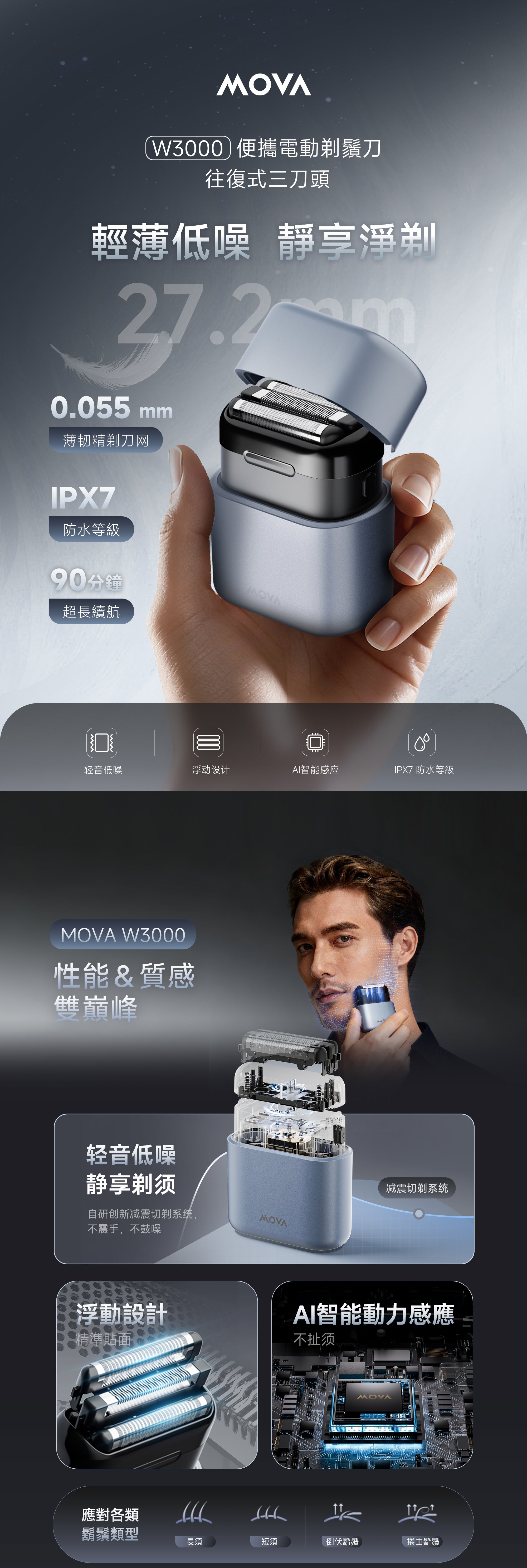 三重柔性刀片:貼合面部輪廓,順滑剃淨不拉扯。