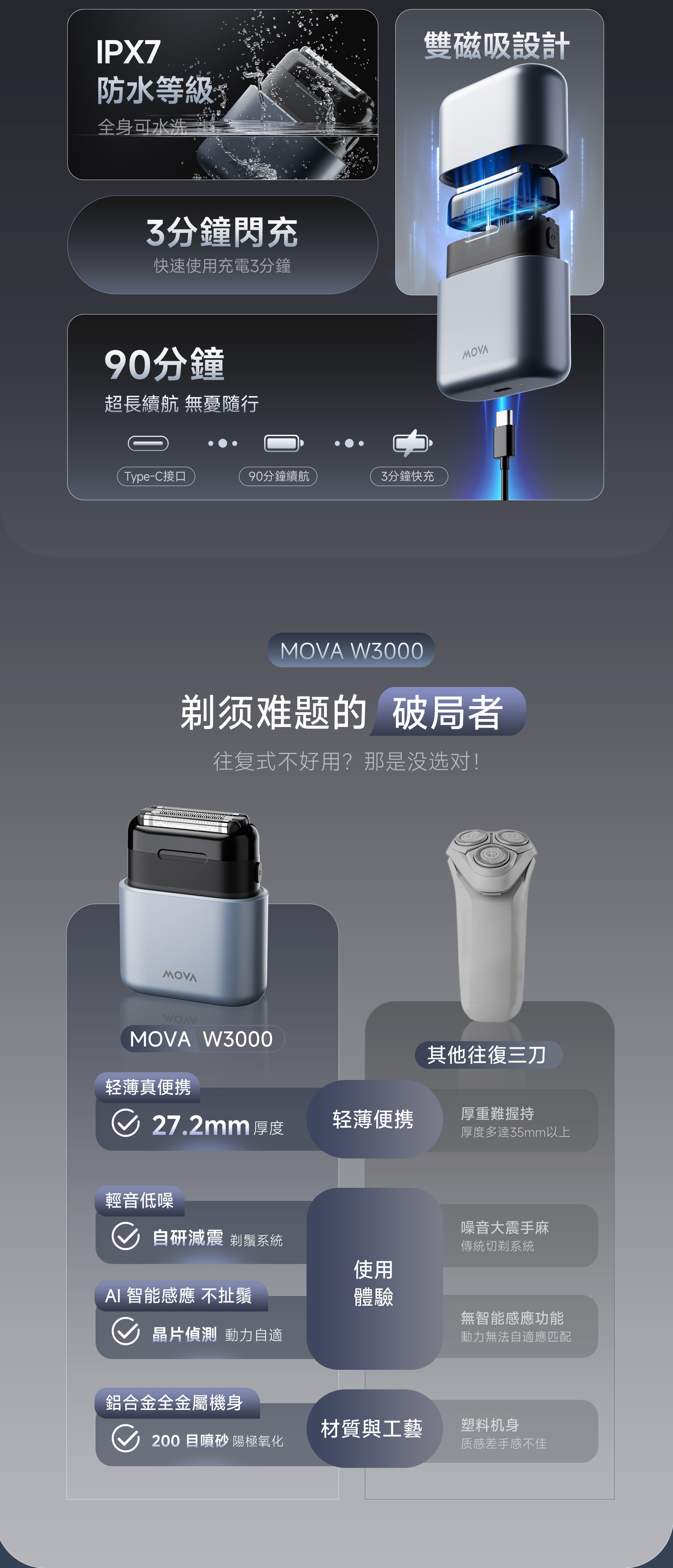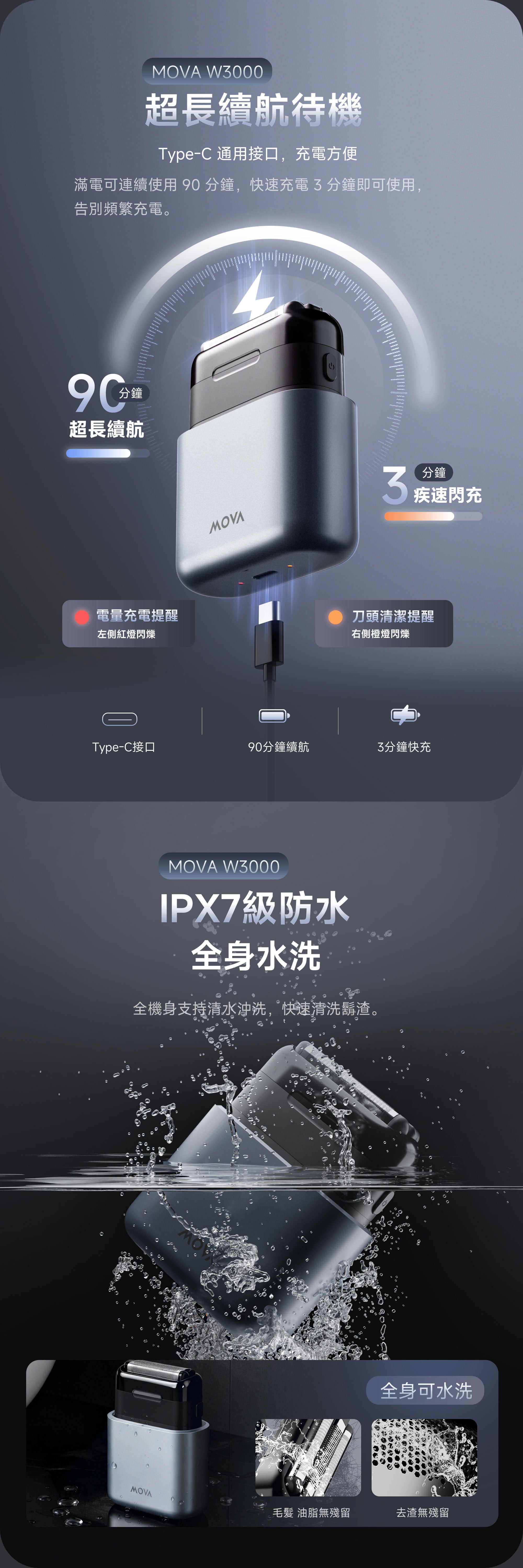 長效電池設計,最長可達 90 日續航;只需 3 分鐘快充,即可滿足一次剃鬚需求。
