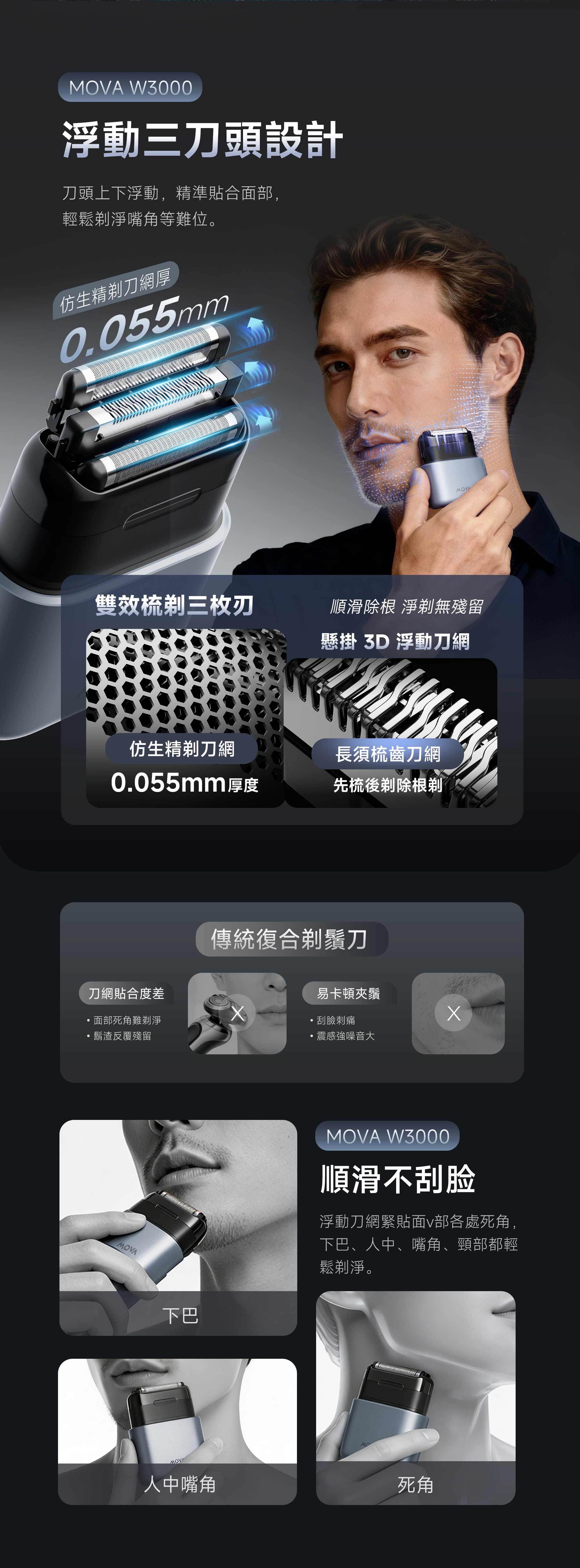 三重柔性刀片設計,可貼合面部輪廓,有效減少拉扯感,剃鬚更順滑舒適。